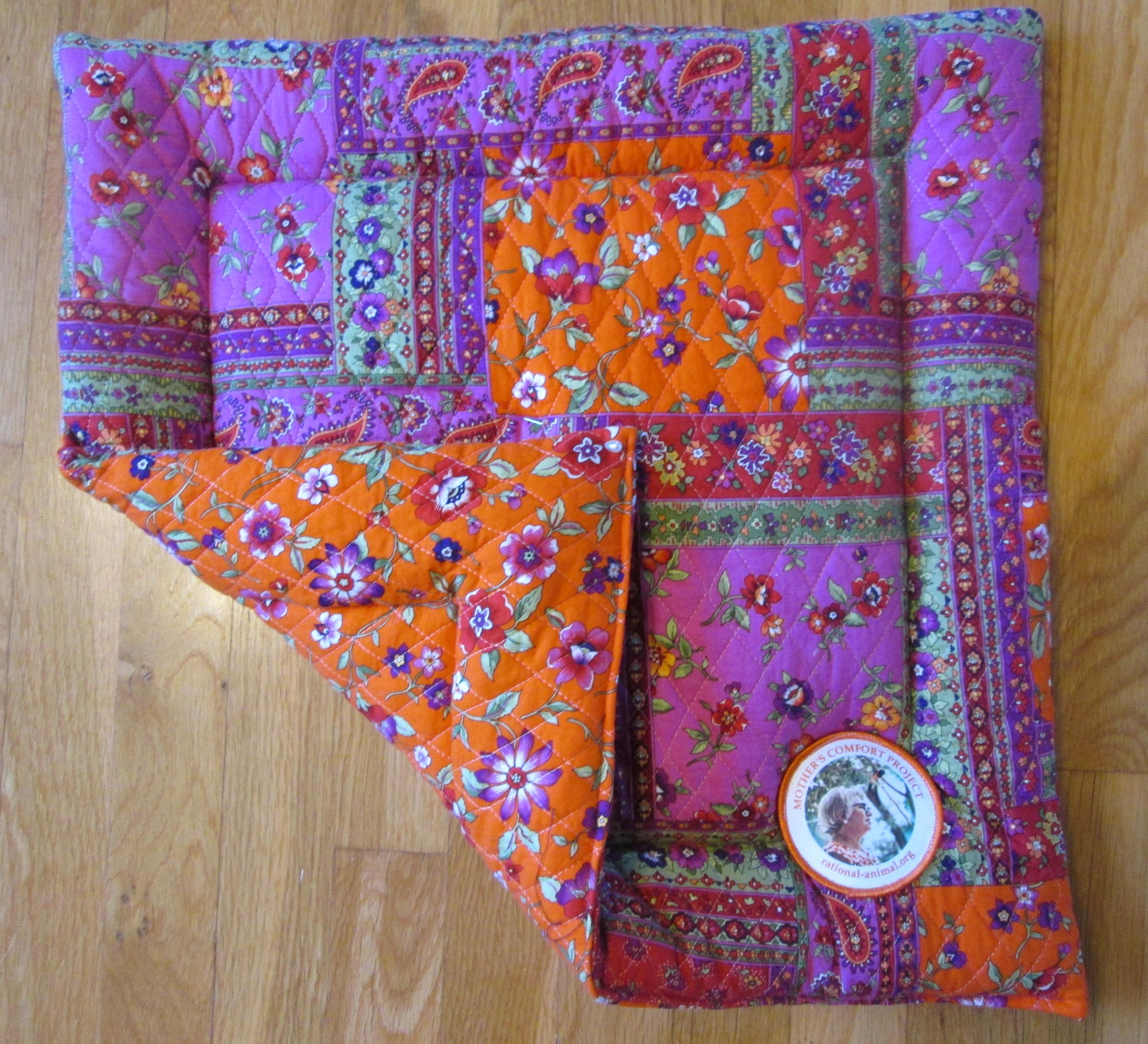 Our handmade pet beds make a wonderful gift for any animal lover! The proceeds of Mother's Comfort Beds go directly to Rational Animal and help supply soft beds, catnip toys and dog pull toys to animals in shelters throughout the Tri-State area. Photo color may vary slightly from actual bed. This bed is more pink and orange than purplish & orange.