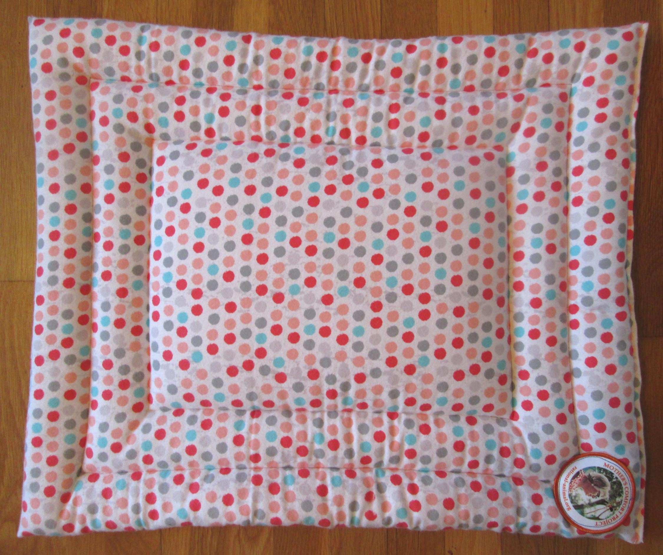 Red, Blue, Gray, & Salmon Polka Dots on White Flannel Bed, 20" x 24"